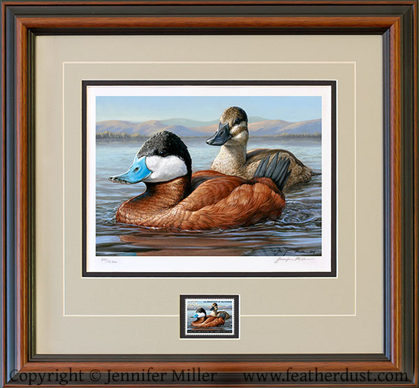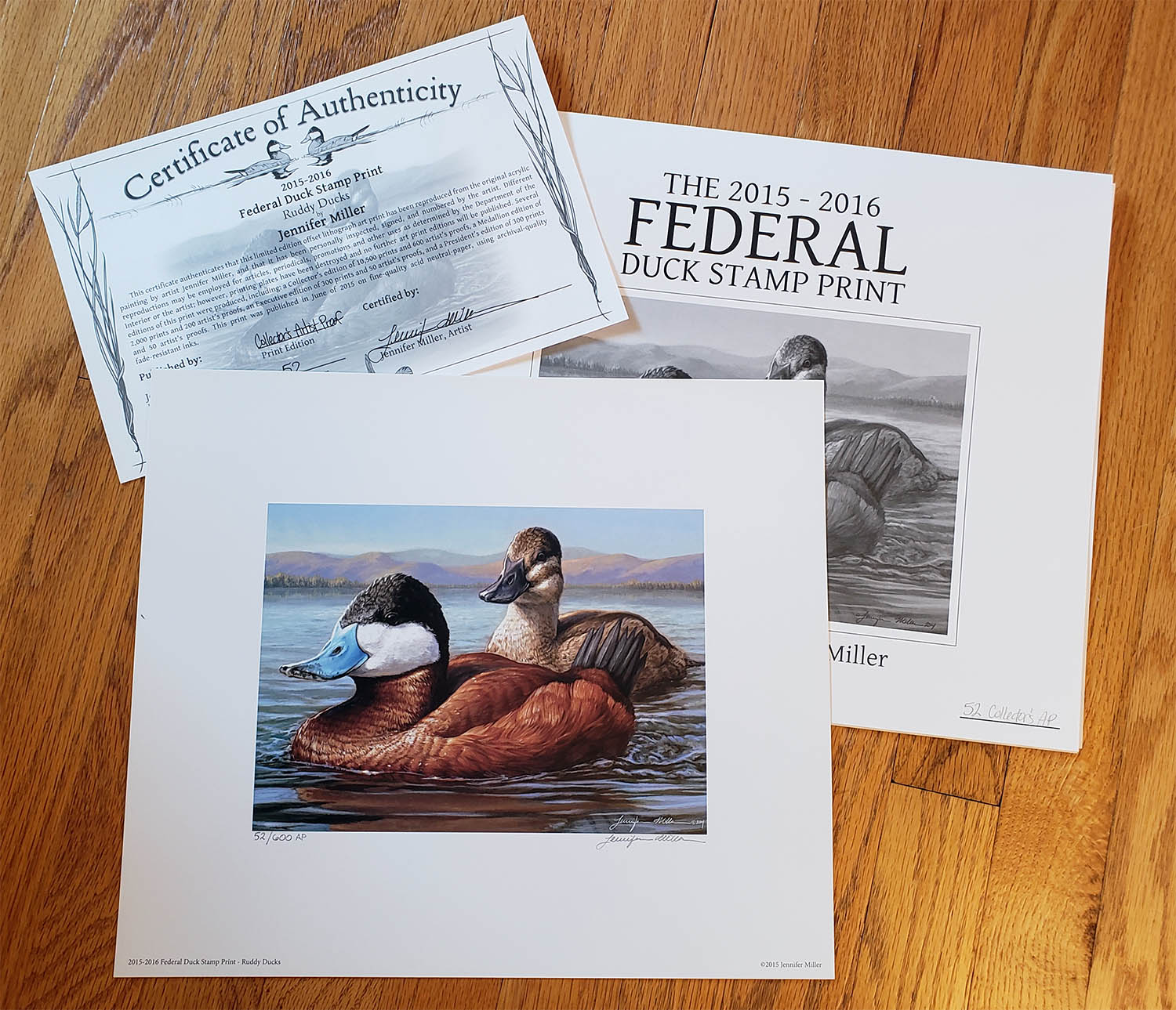 The 2015-2016 Federal Duck Stamp Print presents the charming image of two Ruddy Ducks reproduced on archival paper, using fade resistant inks, printed with offset printing presses. Each print in this edition is hand signed and numbered in pencil by the artist. You will receive a random number from within the edition of 600 Artist's Proofs. Limited quantities are available.