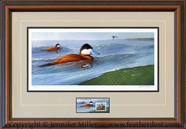 Created by the artist with an emphasis on entire wetland ecosystems, this special painting will be featured as the background of the "PSA" (Pressure Sensitive Adhesive) card issue of the Federal Duck Stamp. It will be reproduced on archival paper, using fade resistant inks. Each print in this edition is hand signed and numbered personally by the artist.