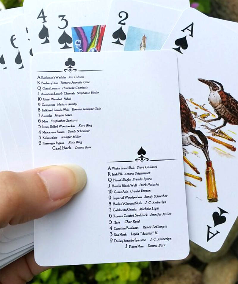 The 6th Extinction playing card deck is a special collaboration between 34 artists, showcasing 54 extinct animals and birds from the ice age to the 1980's. This deck intends to showcase many of the lesser known recently extinct animals, in an effort to raise awareness.
