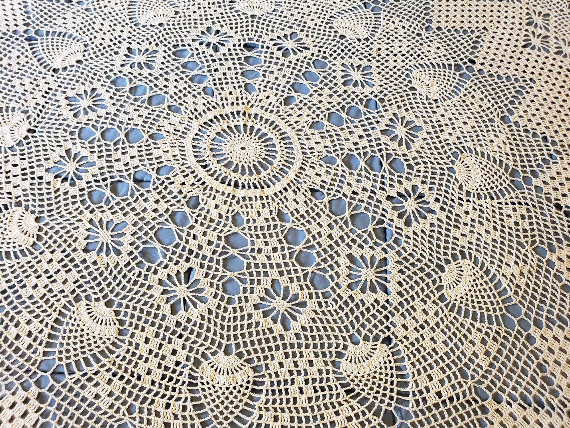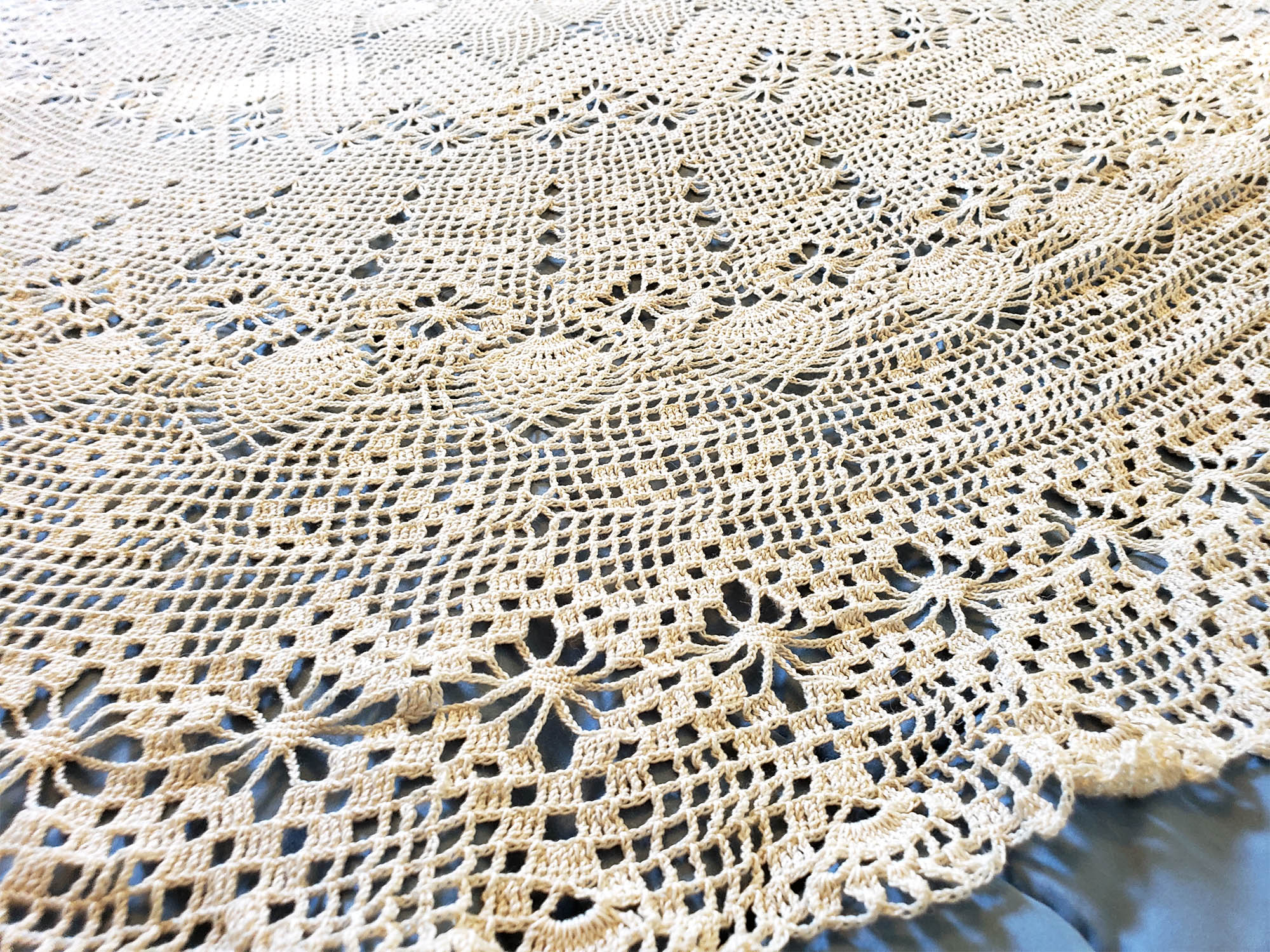Mom has been doing complex crochet patterns for decades, and her attention to detail and craftsmanship are excellent! The photos speak for themselves. It is spread out across a bed so that you can see how it looks. I think these look cool as a duvet topper too, but it is designed as a circular tablecloth.