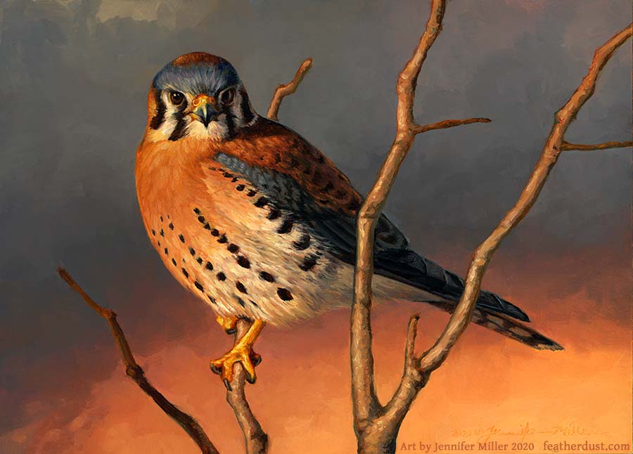 This open edition photo print (a reproduction) was printed from the 5x7" oil painting "Watchful Kestrel". A lovely male kestrel sits in the evening light.
