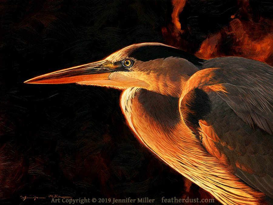 This open edition photo print (a reproduction) was printed from the oil painting "Sharp Intensity". A Great Blue Heron in portrait, touched by the firery glow of evening light.