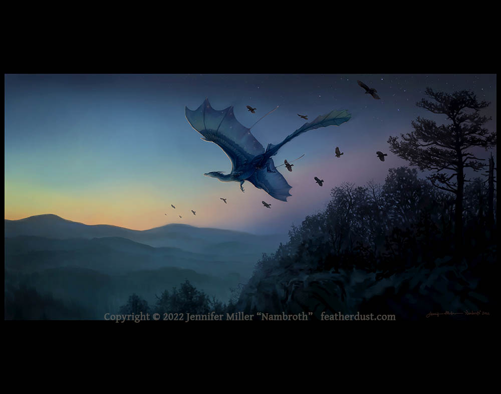 This open edition photo print (a reproduction) was printed from the digital painting "The Weight of Twilight". A dragon with starry wings sweeps across a twilight sky, among a flock of crow companions, the only sound in the still air is that of their wings.