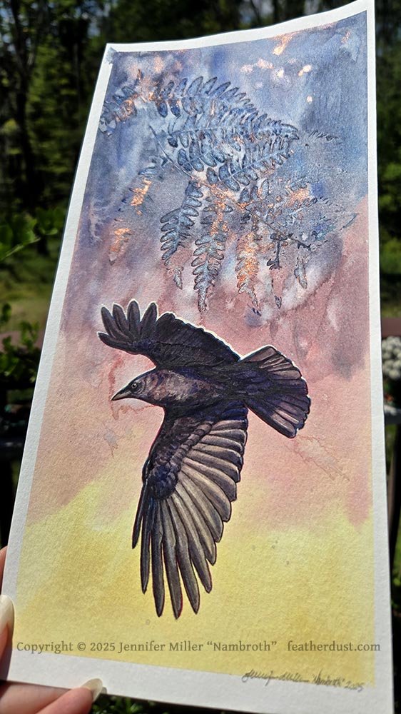 There are subtle iridescent mica pigment shimmers in the fern and a few highlights on the crow that do not show on the digital scan. The photo of the painting in the sunlight shows some of this "flash" of color.
