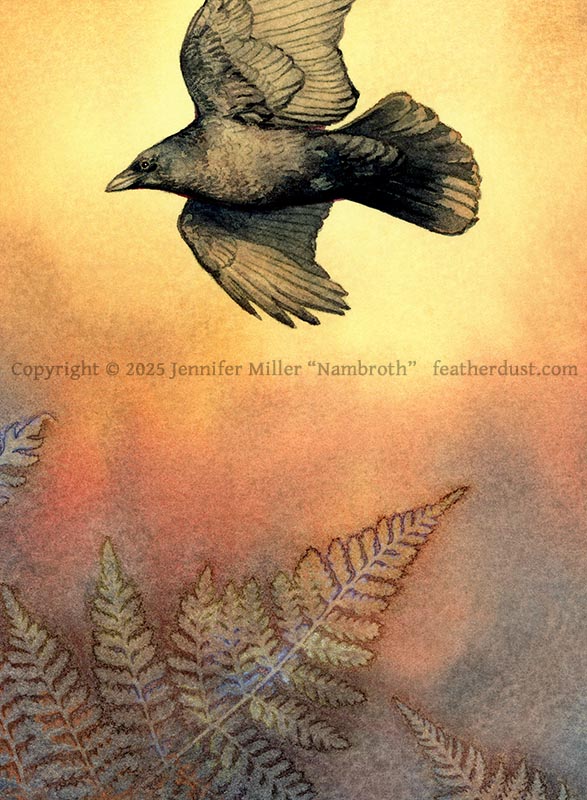 There are subtle iridescent mica pigment shimmers in the fern and a few highlights on the crow that do not show on the digital scan. The photo of the painting in the sunlight shows some of this "flash" of color.