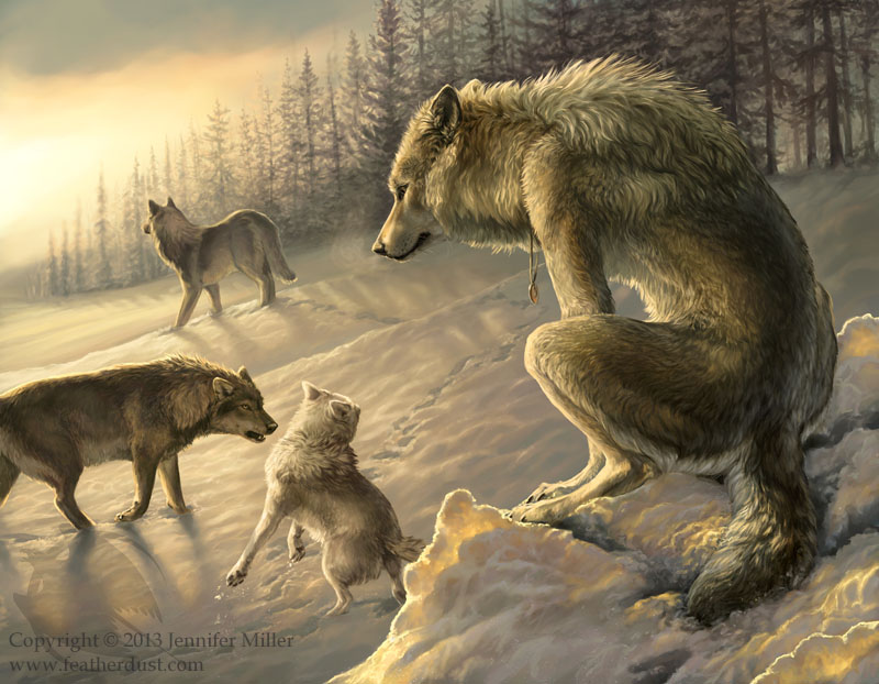 This open edition photo print (a reproduction) was printed from the digital painting "From Afar". Painted for the 2014 Werewolf Calendar (www.werewolfcalendar.com), a lonely and outcast werewolf watches on as a pack of normal wolves gather.